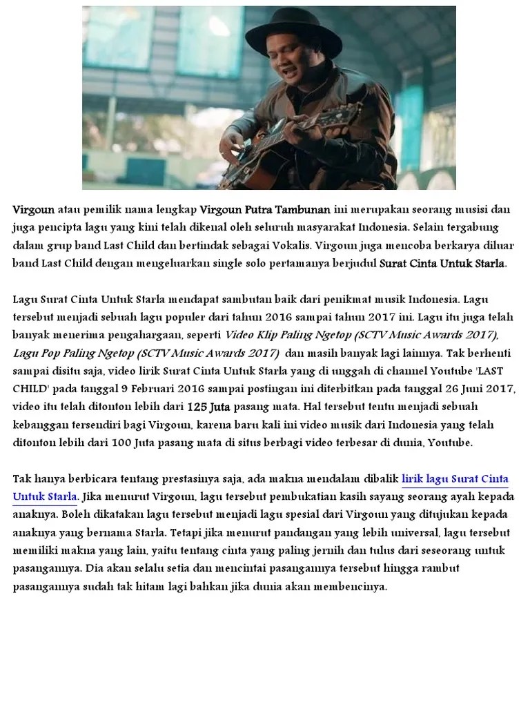 Ku tuliskan kenangan tentang caraku menemukan dirimu tentang apa yang buatku mudah berikan hatiku padamu. Virgoun pun menyimpan lagu tersebut hingga akhirnya menikah dan dikaruniai buah hati bernama starla. Berikut cuplikan syair nyanyian / teks dari lagunya: Lagu 'surat cinta untuk starla' akhirnya tersusun dengan ciamik. Seperti, lirik lagu dangdut, tarling, jawa, pop, barat, korea, india.